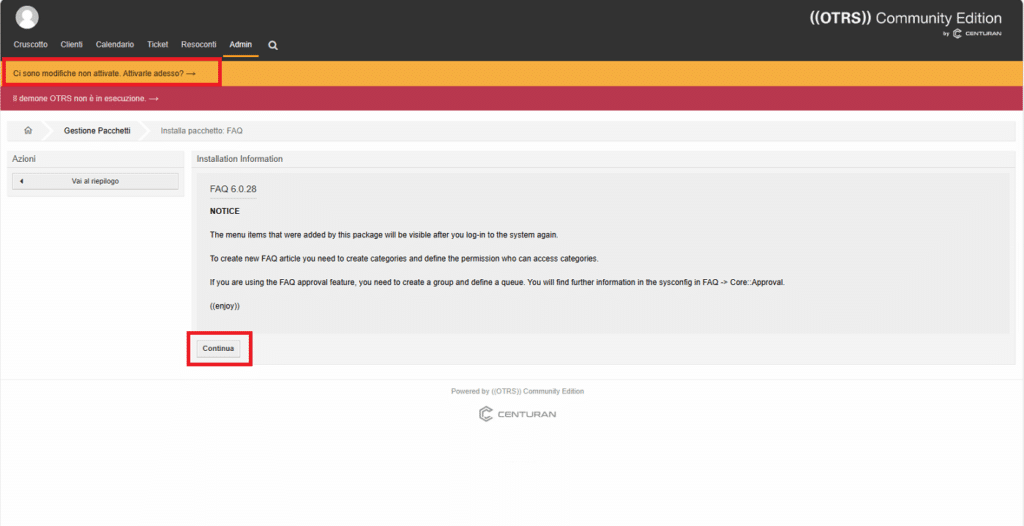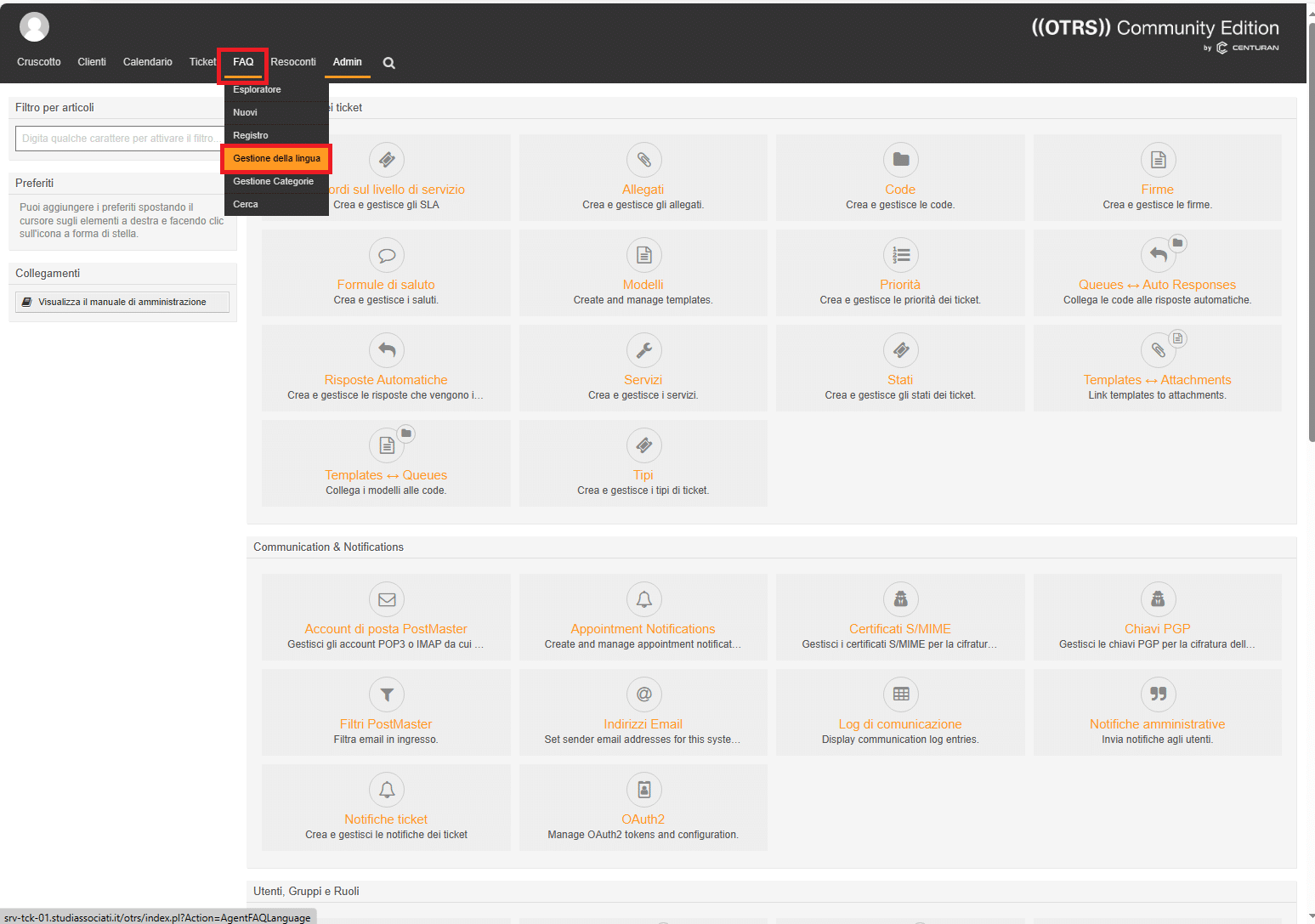 Se è andato tutto a buon fine dovremmo vedere all’interno del menù di OTRS la voce FAQ