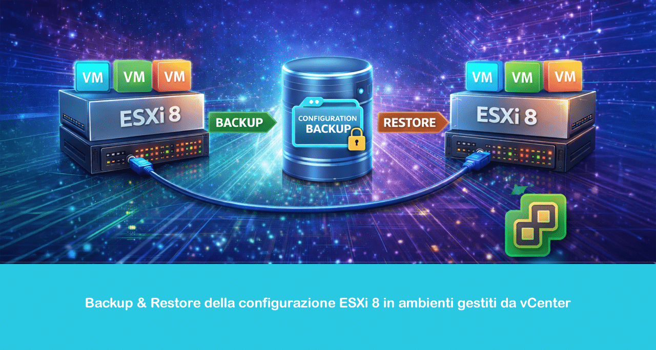 In questo articolo vedremo come eseguire correttamente il backup e il restore della configurazione di ESXi 8 in infrastrutture centralizzate, evidenziando strumenti, prerequisiti e accorgimenti fondamentali per evitare incompatibilità o perdita di dati.