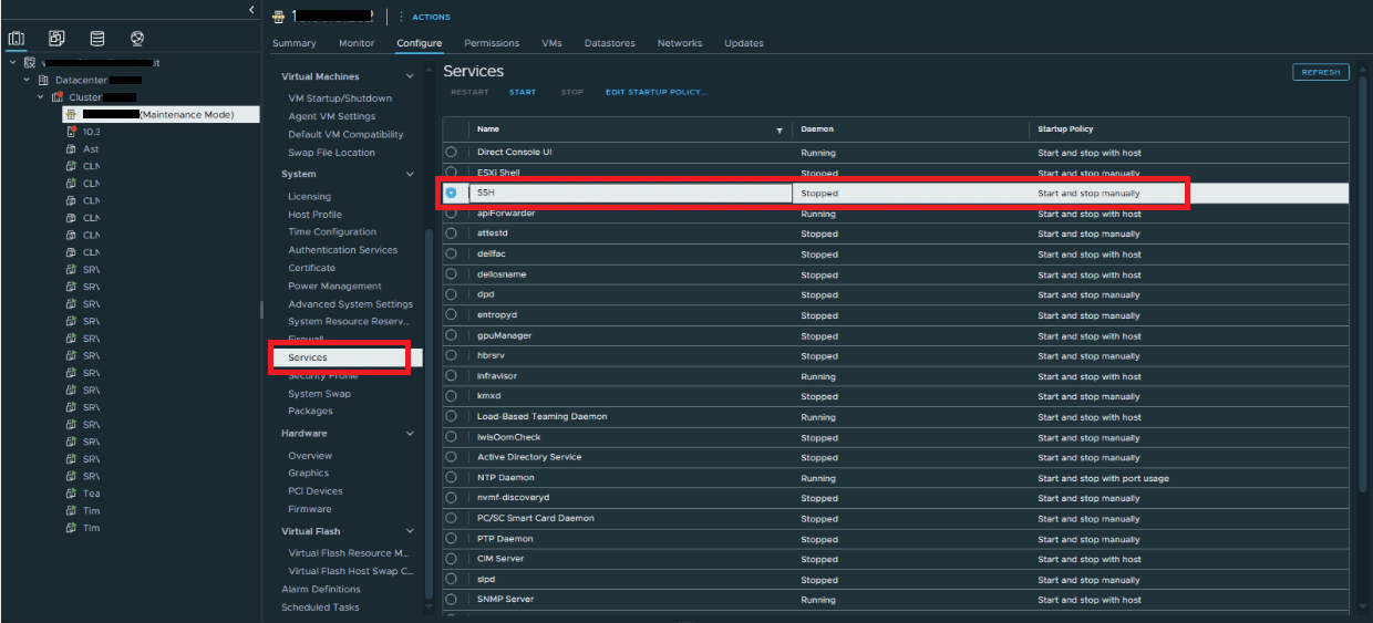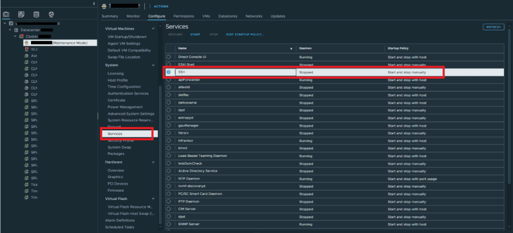 A questo punto abilitare l’SSH sull’Host ESXi