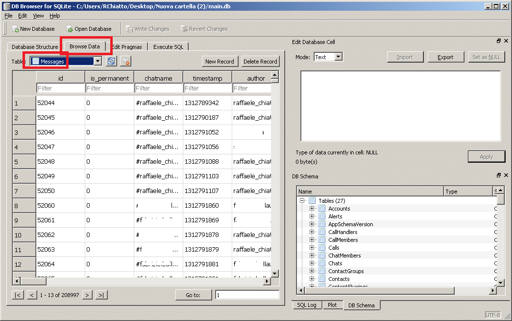 Per riuscire ad aprire questo particolare archivio basta utilizzare, ad esempio, SQLite Database Browser, ovvero, un programma completamente gratuito, compatibile con i sistemi operativi Windows, Mac OS X e Linux (per Windows è disponibile anche in versione portatile, cioè può essere utilizzato senza neanche la necessità di essere installato sul proprio PC), capace appunto di leggere gli archivi in formato SQL, ossia, proprio nel formato che viene utilizzato da Skype.