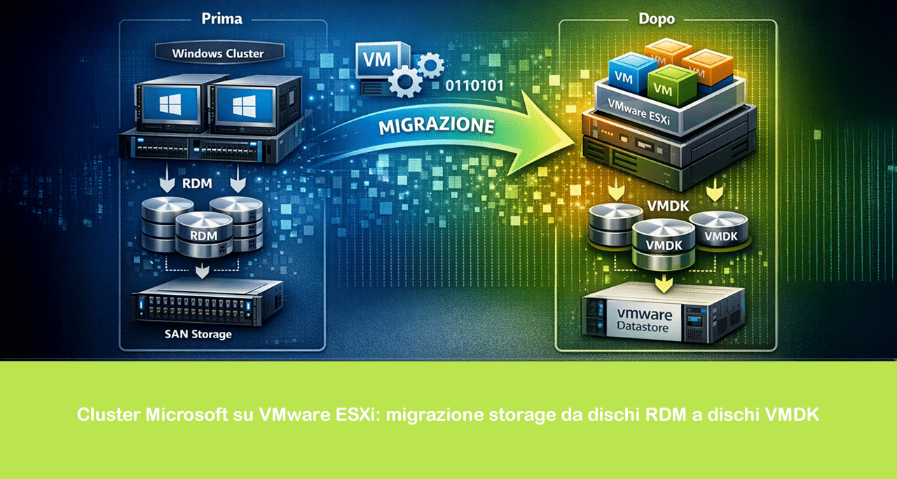 Nei cluster Microsoft ospitati su VMware ESXi, una delle attività più delicate è la migrazione dello storage, in particolare quando si passa da dischi RDM (Raw Device Mapping) a dischi VMDK.