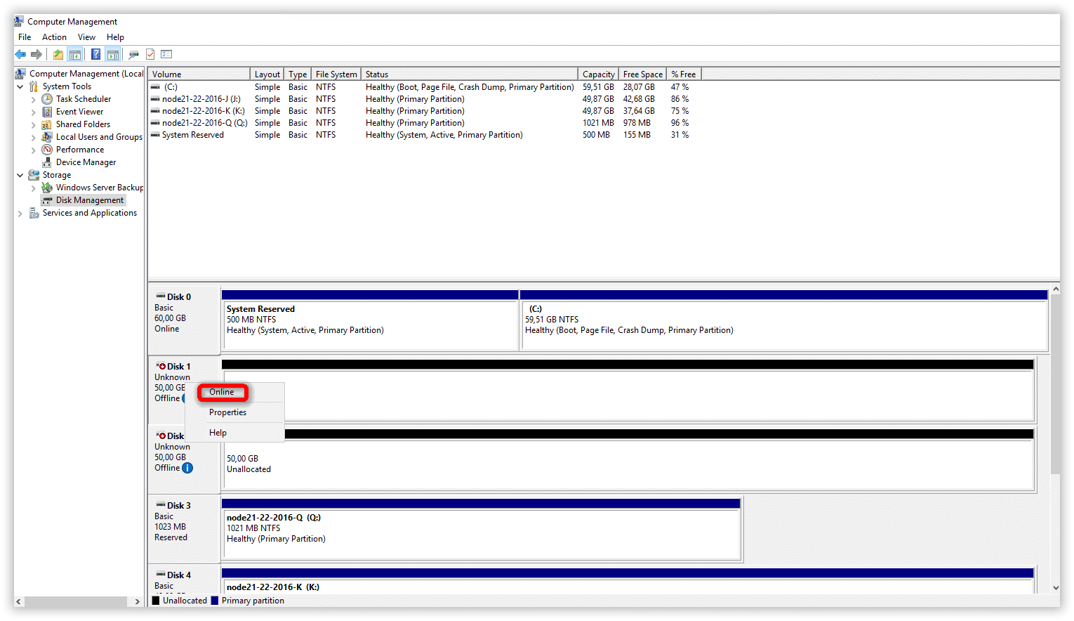 Avviare i nodi e accedere al nodo attivo con i dischi in carico.