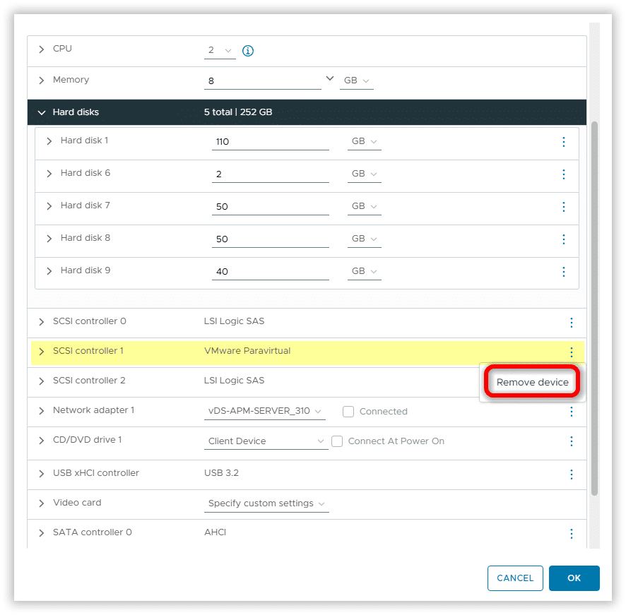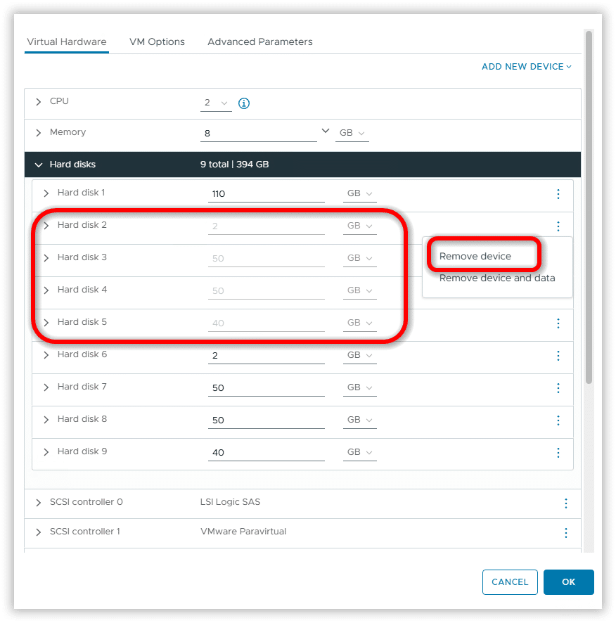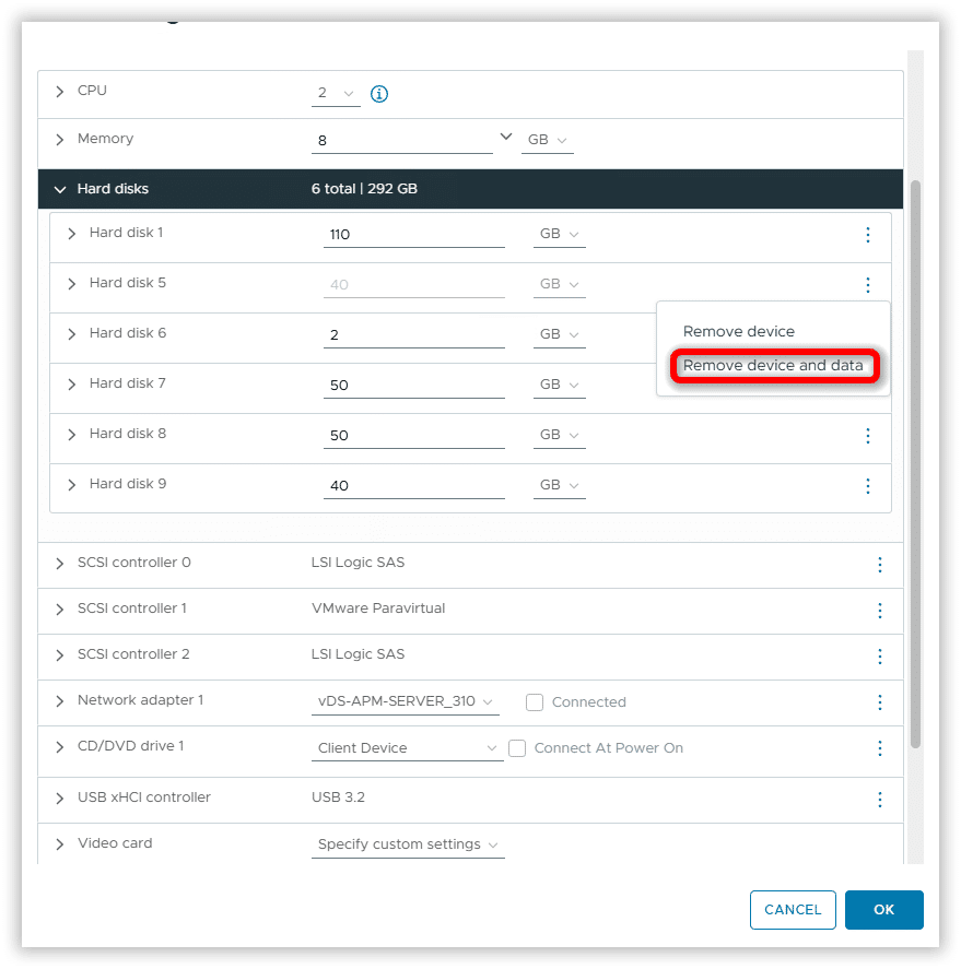 Sull’ ultimo Nodo rimuovere i disci RDM cliccando su Remove device and data