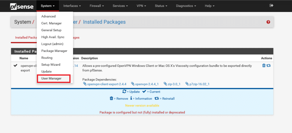 Andare su System quindi Package Manager -> Available Packages e cercare openvpn-client-export.