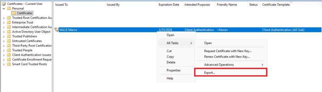 Per esportare un certificato e la relativa chiave privata è necessario selezionarlo, effettuare click destro, navigare con il mouse su All Tasks e selezionare Export: