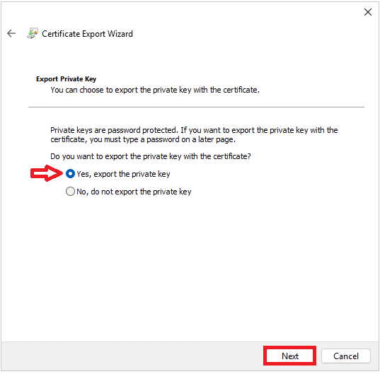 Selezionare Yes, export the private key e cliccare su Next: