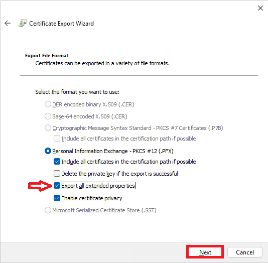 Selezionare Export all extended properties e procedere cliccando su Next: