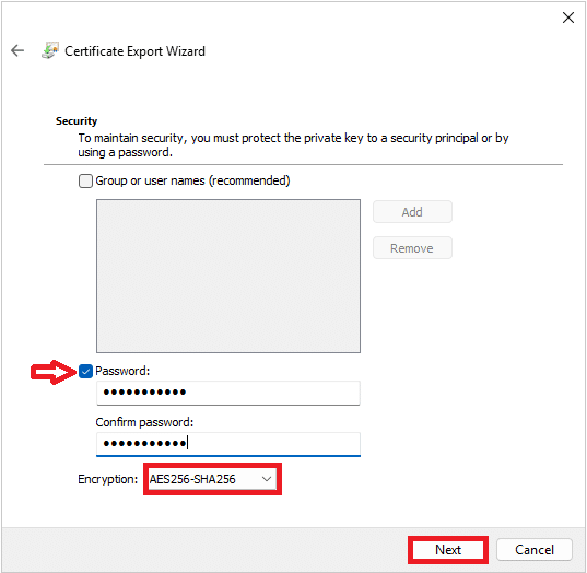 Abilitare Password, sceglierne una e scriverla due volte, modificare l’agoritmo di criptografia in AES256-SHA256 e cliccare su Next: