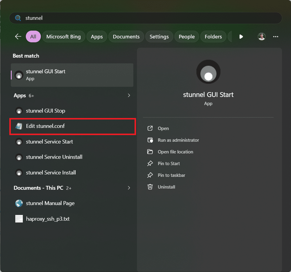 Per aprire la configurazione di Stunnel è possibile eseguire Edit stunnel.conf dal menù Start: