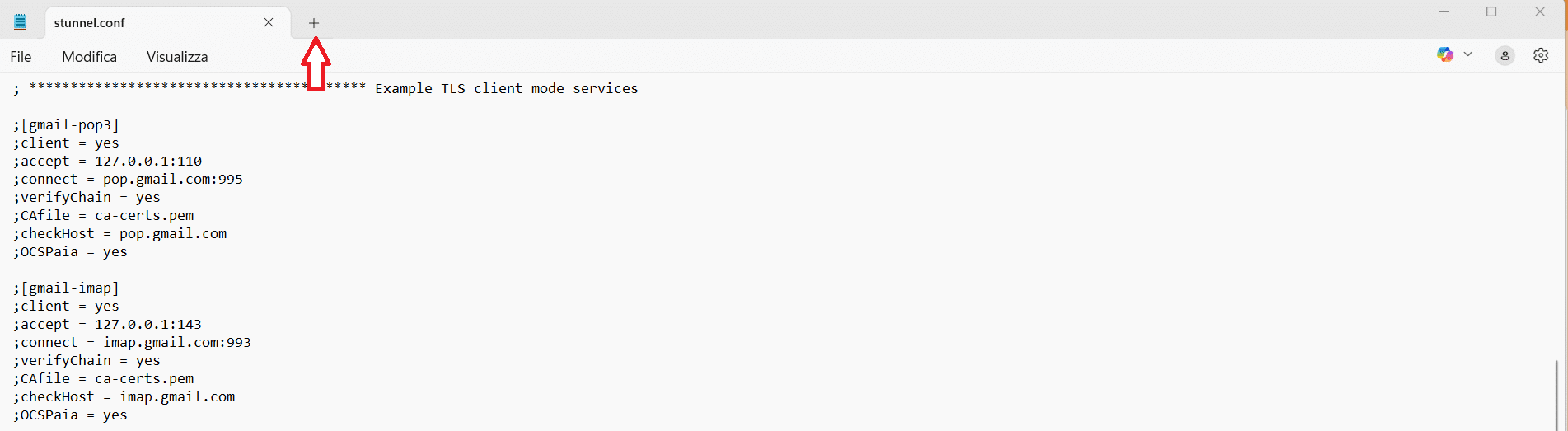 Per creare la cartella e le configurazioni è possibile utilizzare lo stesso blocco note che si stava utilizzando per modificare il file stunnel.conf, per farlo aprire un nuovo tab cliccando sul simbolo + in alto:
