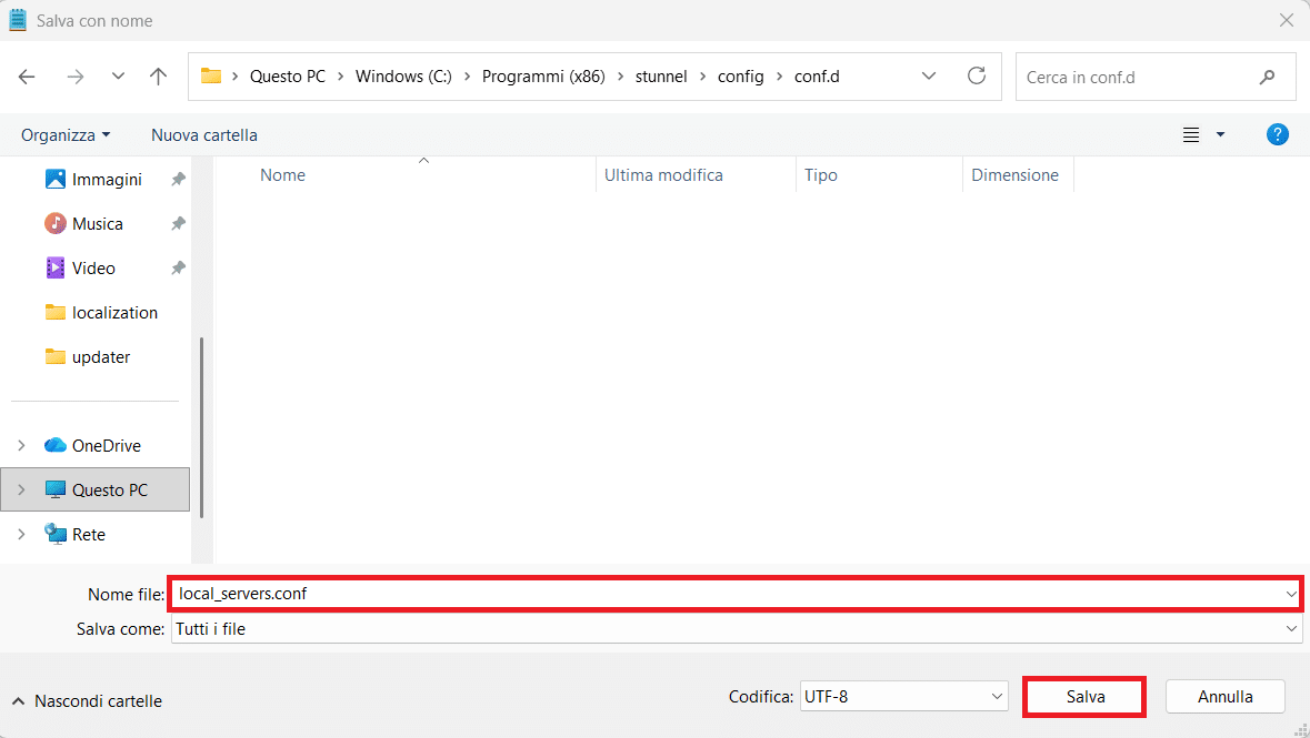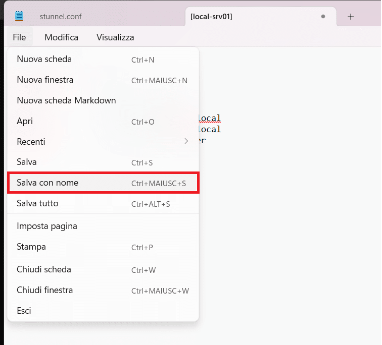 Oppure, in alternativa, è possibile aprire il file C:\Program Files (x86)\stunnel\config\stunnel.conf con un editor di testo con privilegi amministrativi.