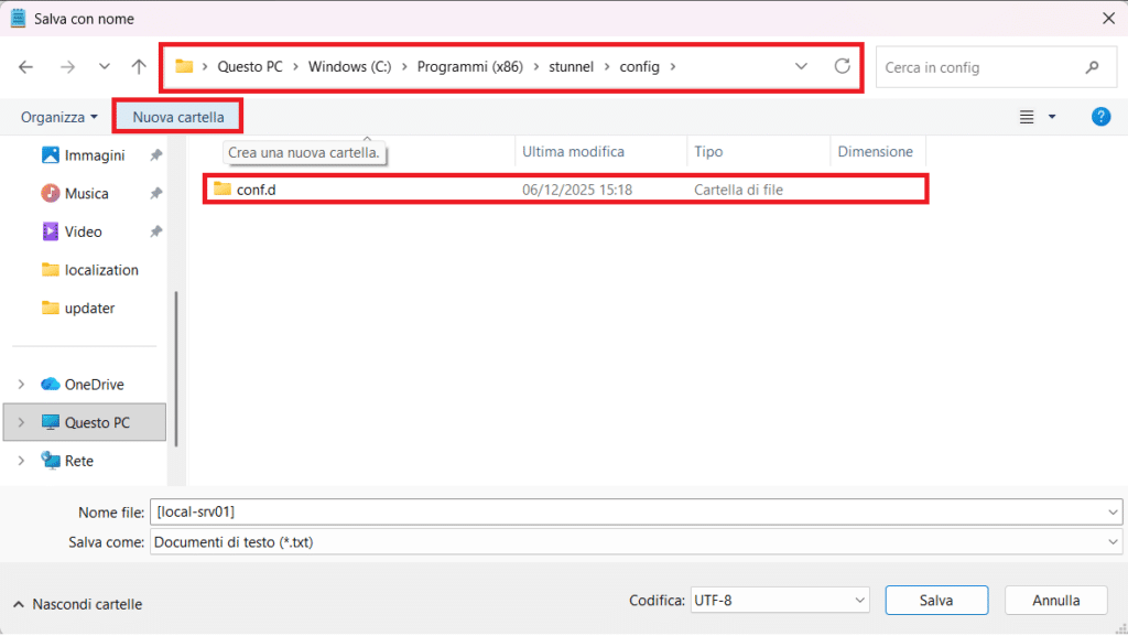 Navigare al percorso C:\Program Files (x86)\stunnel\config, creare la folder conf.d cliccando su New folder e navigarci all’interno: