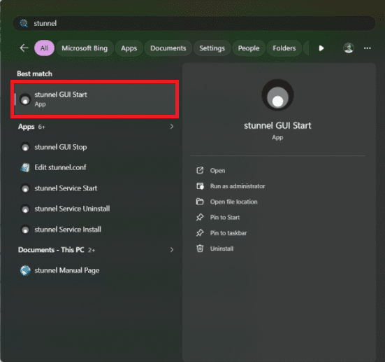 Per avviare i tunnels è possibile eseguire stunnel GUI Start dal menù Start: