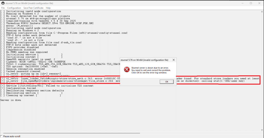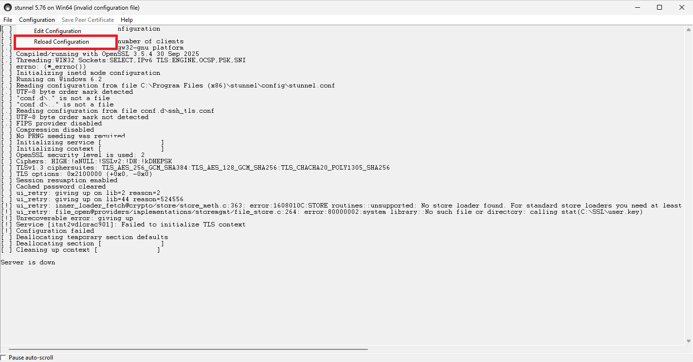 In questi casi correggere l’errore, cliccare su Configuration nella UI di Stunnel e poi su Reload Configuration: