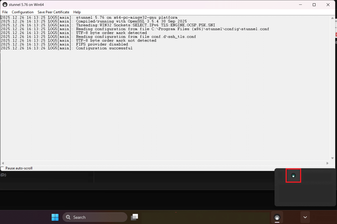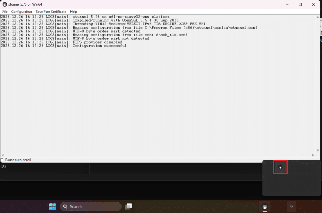 Mentre Stunnel è in esecuzione è possibile visualizzare la sua interfaccia grafica cliccando sulla sua icona in basso a destra: