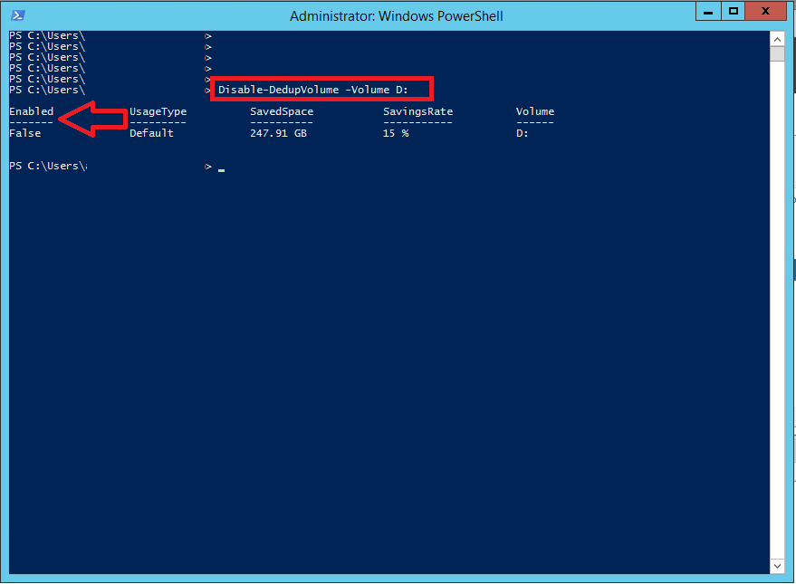 Adesso visto che la pulizia è terminata disattiviamo definitivamante la Deduplica lanciando il seguente comando da Powershell: