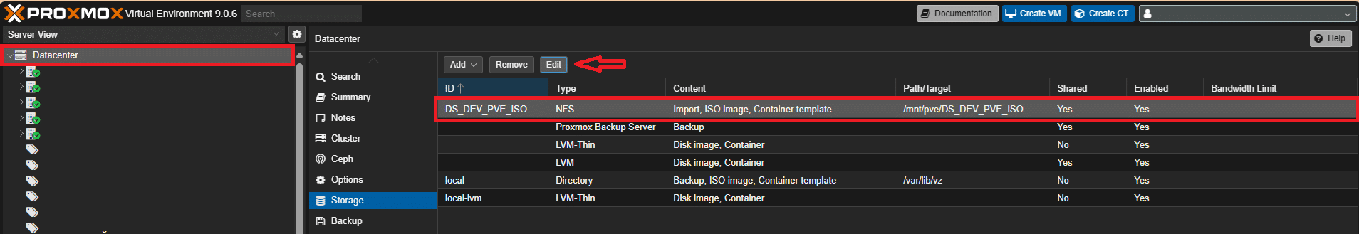 Navigare su Datacenter e poi Storage, selezionare il datastore su cui si vuole abilitare la tipologia e cliccare su Edit: