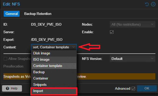 Per abilitarla, in modo analogo a come si ha abilitato la tipologia Import, abilitare la tipologia Disk image per il datastore su cui si è effettuato l’upload del file OVA:
