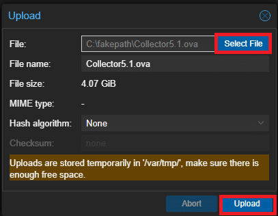 Cliccare su Select File per selezionare il file OVA e confermare cliccando su Upload: