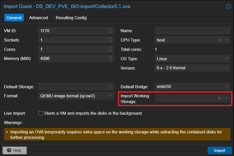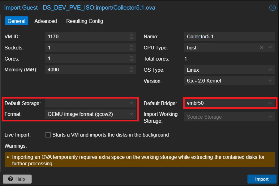 Selezionare il datastore su cui importare la VM, il formato dei dischi, il bridge da collegare alle schede di rete ed opzionalmente selezionare la CPU e modificare il nome: