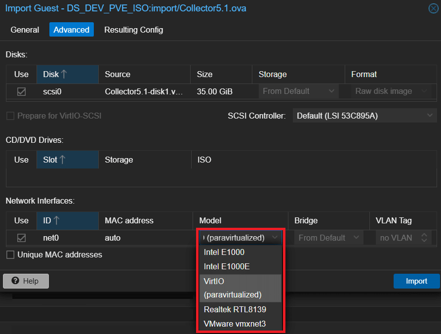 Nel tab Advanced è possibile modificare la tipologia di schede di rete da VMware vmxnet3 a VirtIO: