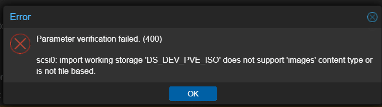 Se viene mostrato un errore come il seguente significa che il datastore utilizzato come Import Working Storage non supporta i dischi delle VM: