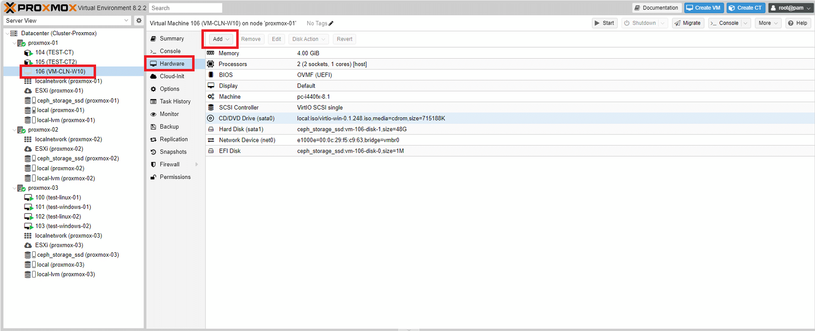 Dalla GUI di Proxmox selezionare la VM importata quindi cliccare su Hardware quindi Add
