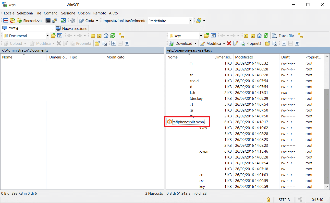 Per prelevare i file di configurazione appena creati possiamo utilizzare WinSCP accedendo con l’utenza di root e copiandoli sul nostro PC.