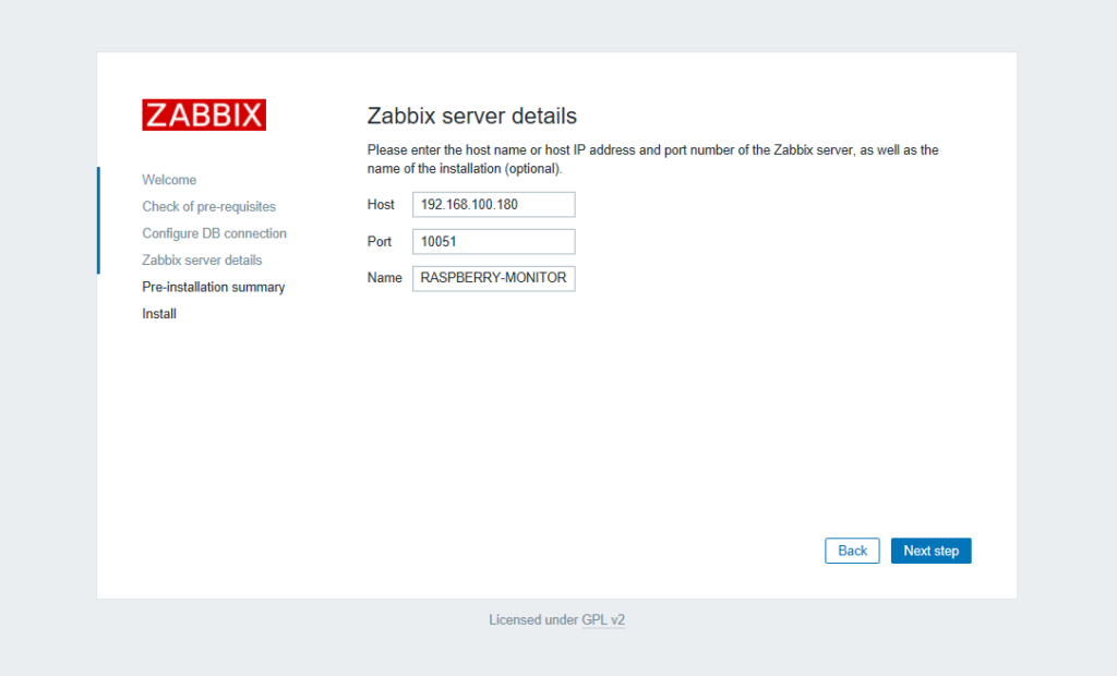 Impostare Indirizzo IP , porta e Nome del server Zabbix quindi cliccare Next step