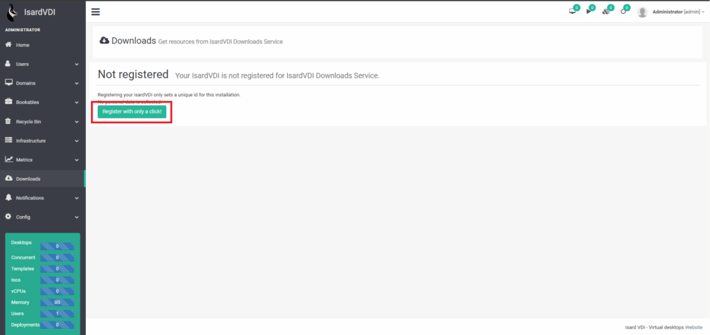Registrare IsardVDI cliccando sul pulsante Register with only click!