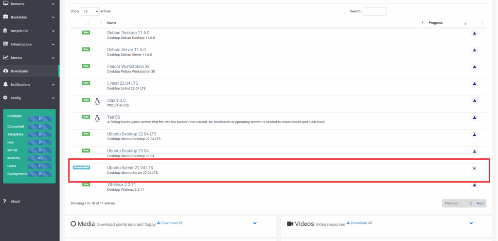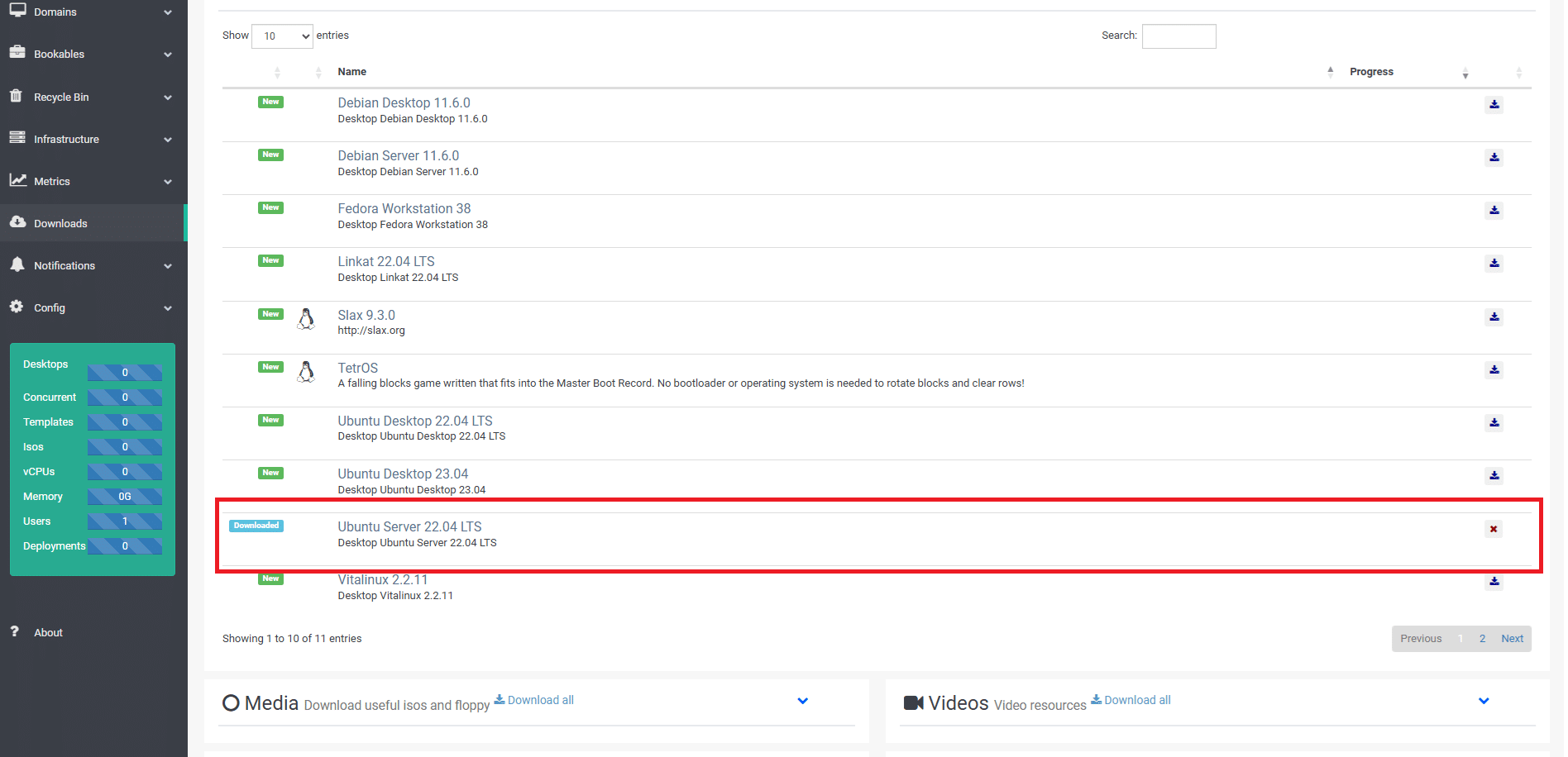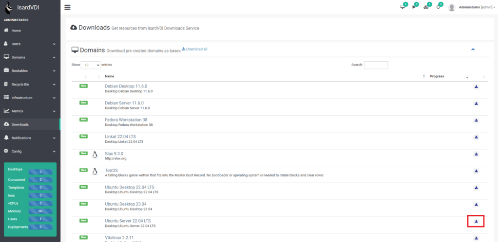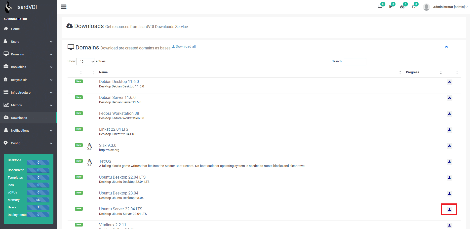In questa sezione è possibile scaricare delle macchine virtuali (domini) già preconfigurate, che è possibile usare come base per creare rapidamente nuovi desktop virtuali.