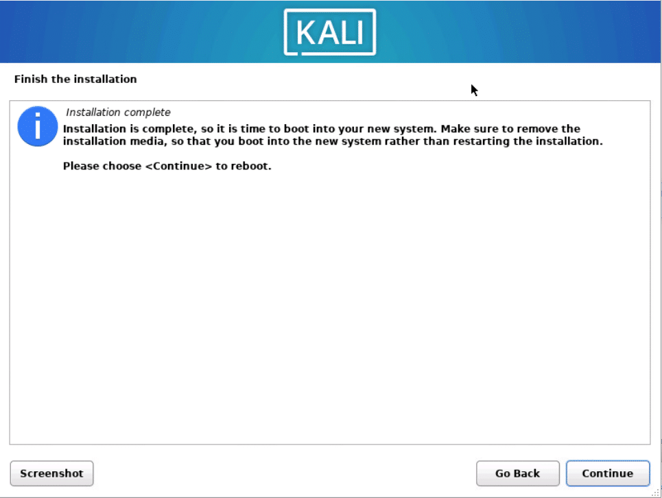 Rimuovere il disco di installazione quindi cliccare Continue per riavviare il server