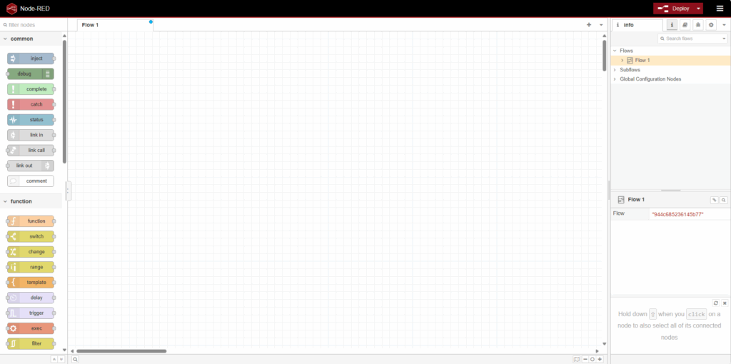 Dovremmo visualizzare la Home di Node-Red come mostrato nell’immagine sovrastante