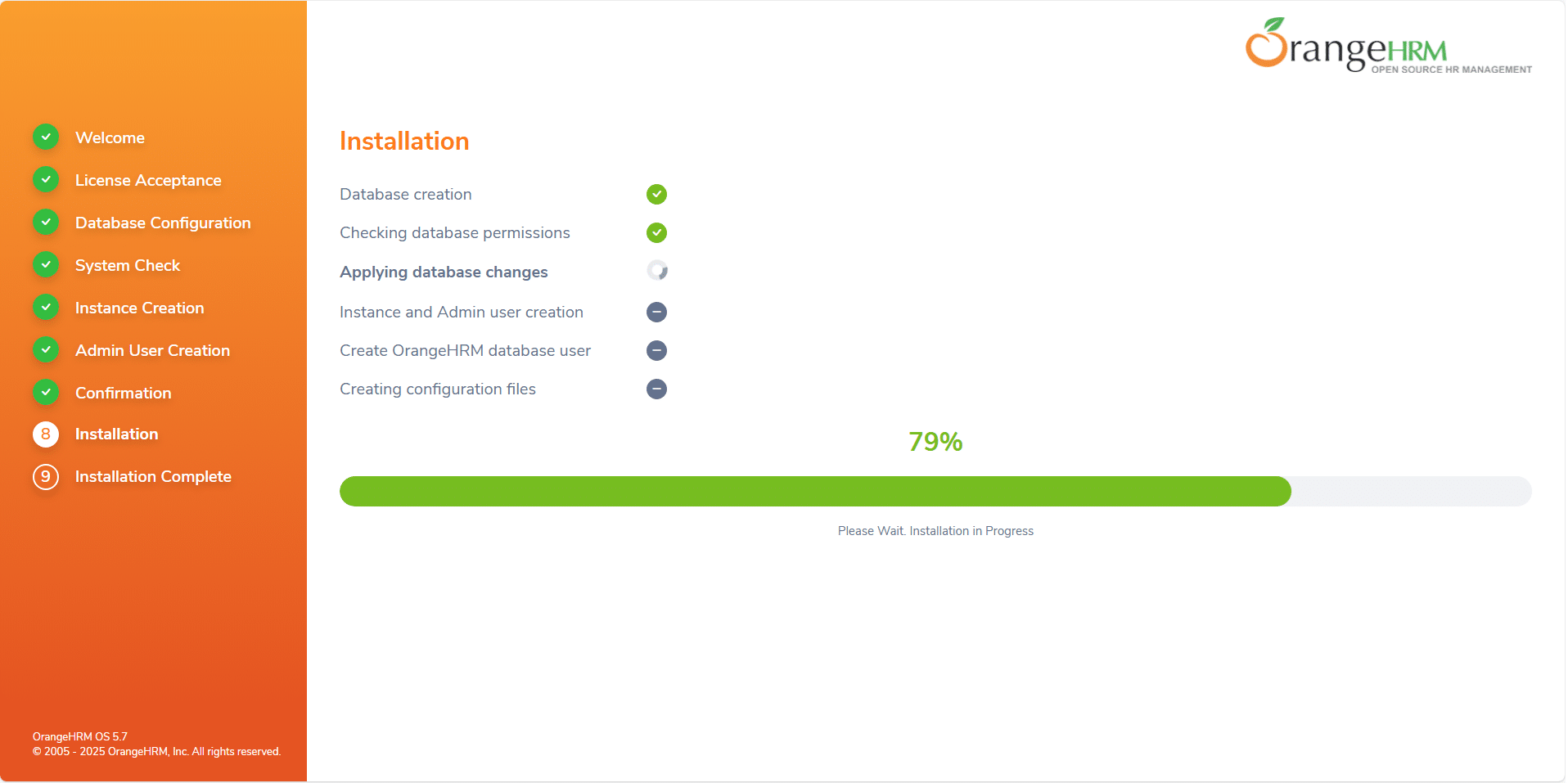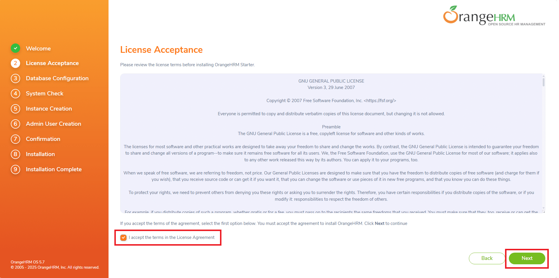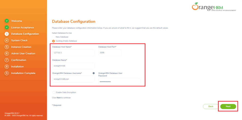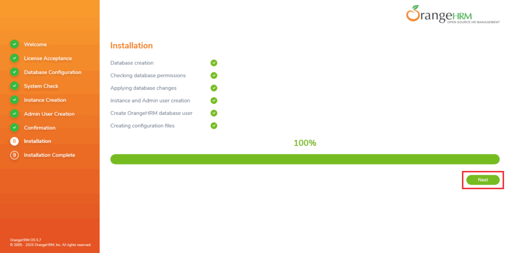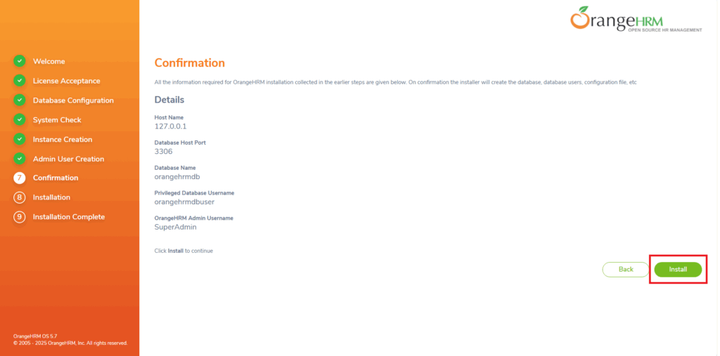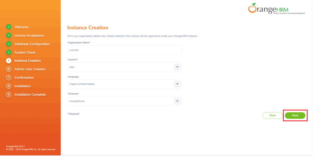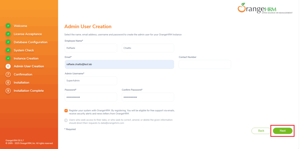 Per ricevere assistenza via mail spuntare l’opzione Register your system with OrangeHRM. By registering, You will be eligible for free support via emails, receive security alerts and news letters from OrangeHRM.