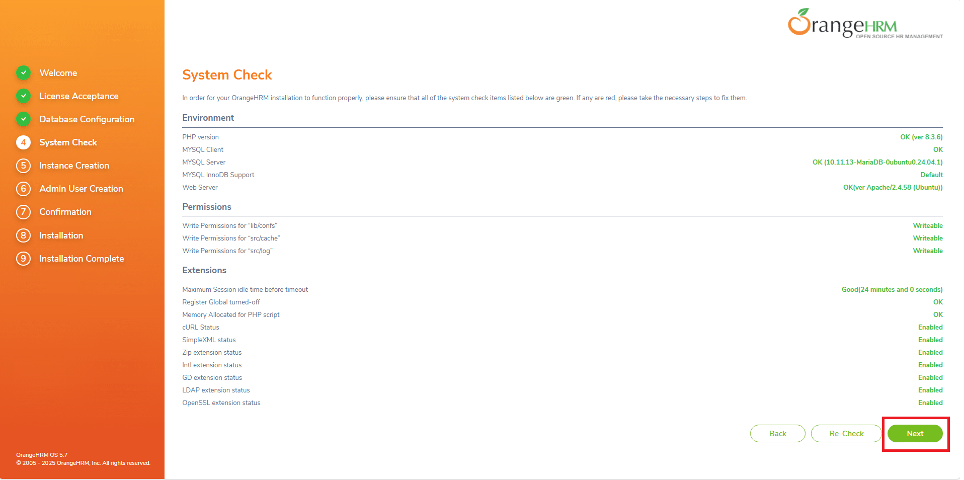 Veriricare che sia tutto OK (tutto verde) come mostrato nell’immagine sovrastante quindi cliccare Next