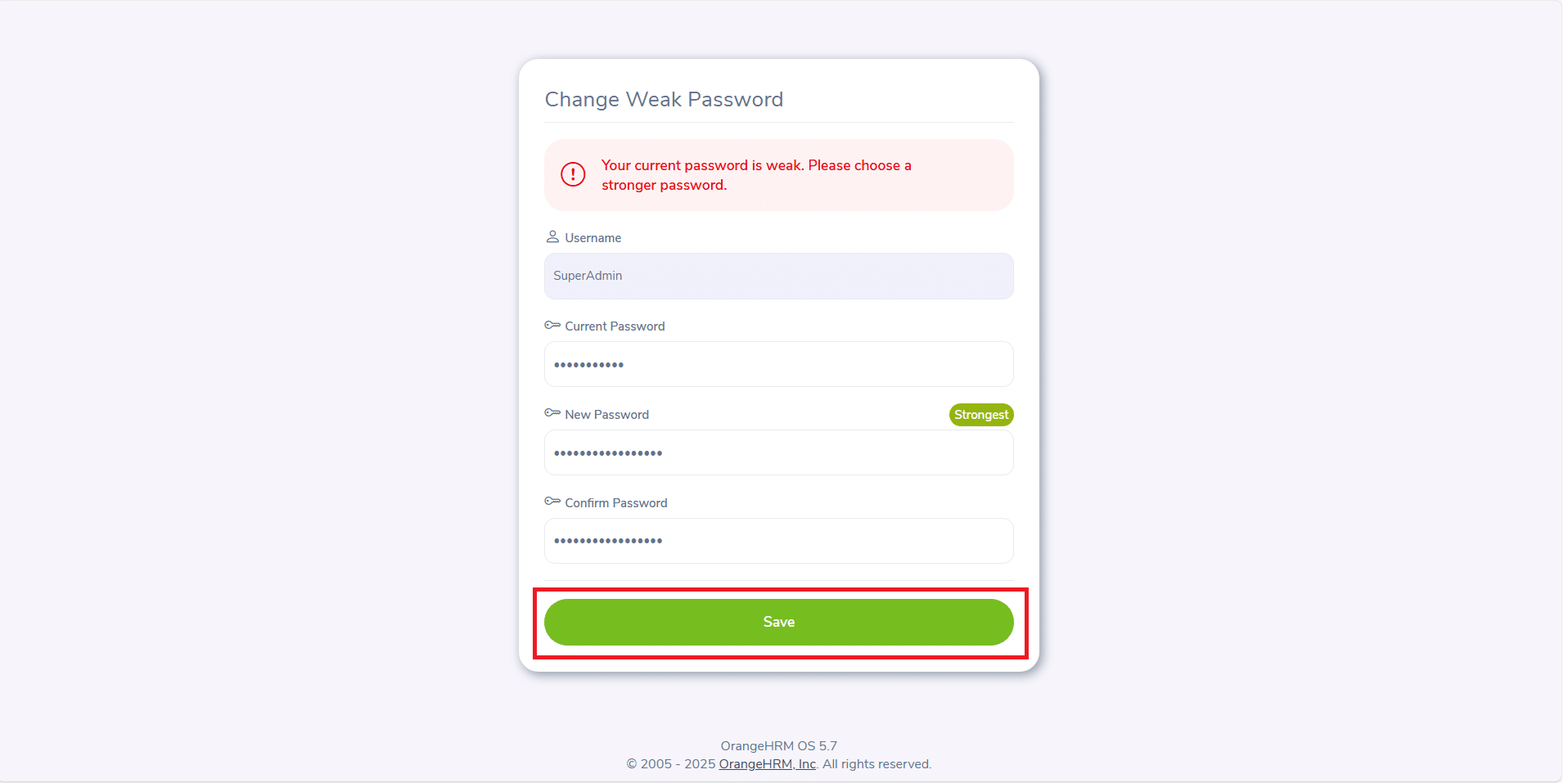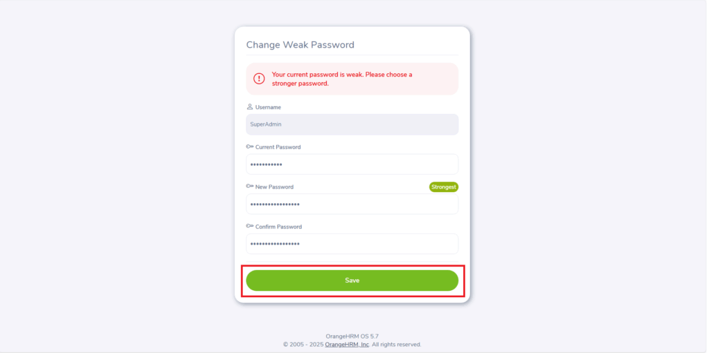 Se abbiamo inserito una password debole in fase di configurazione ci verrà richiesto di modificare la password inserendone una strong