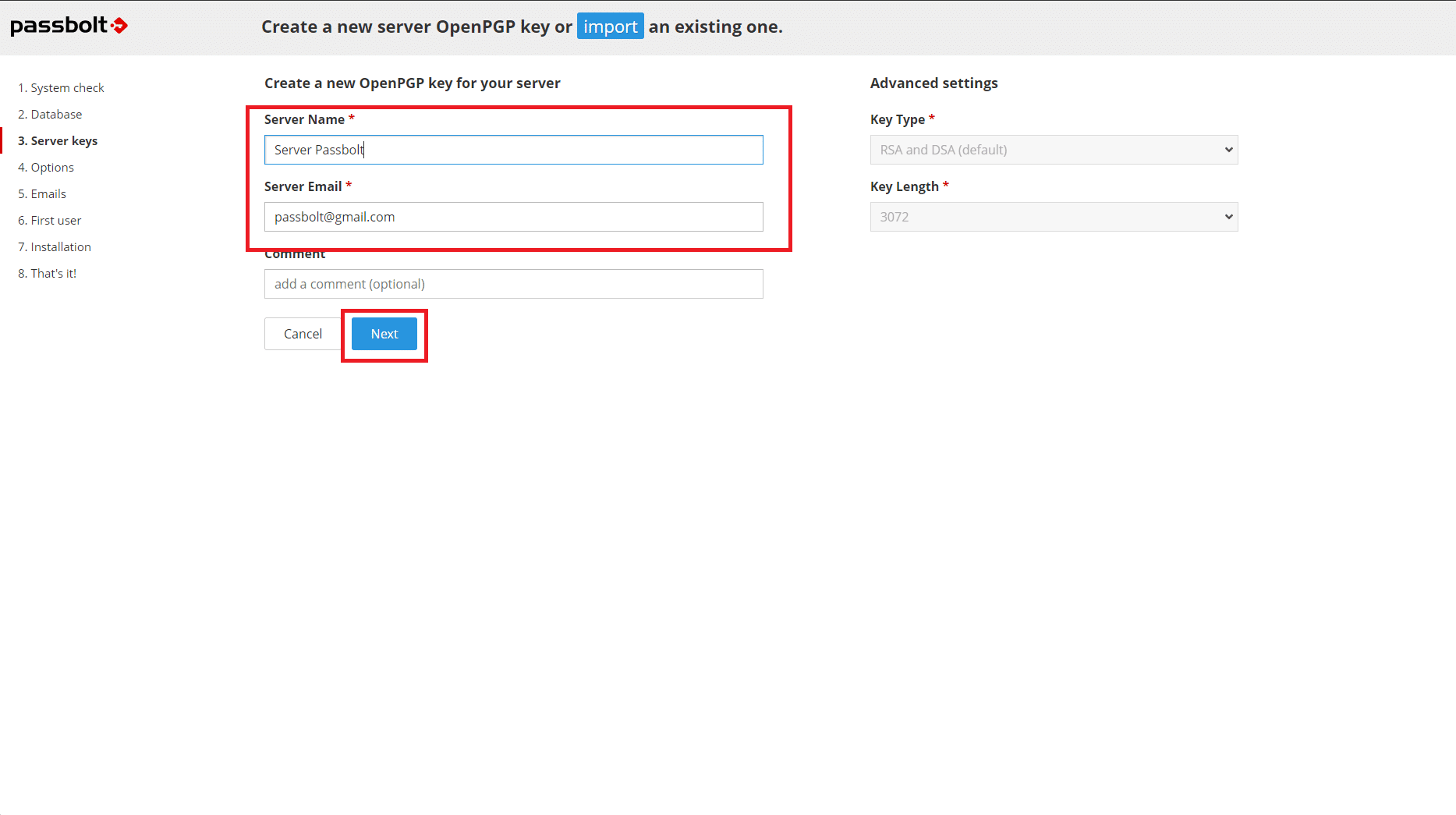 Inserire il Server Name e la Mail del Server quindi cliccare Next
