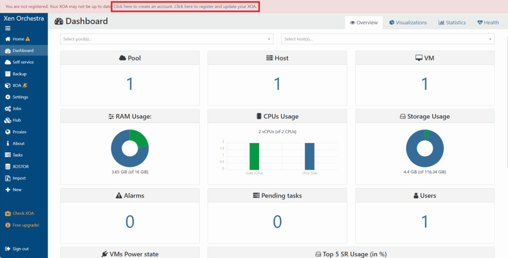NOTA BENE: Non è obbligatorio registrare XOA per usarla in versione community/open source. La registrazione non invia dati sensibili o VM al portale — solo info sulla tua appliance (versione, ID univoco, ecc.).