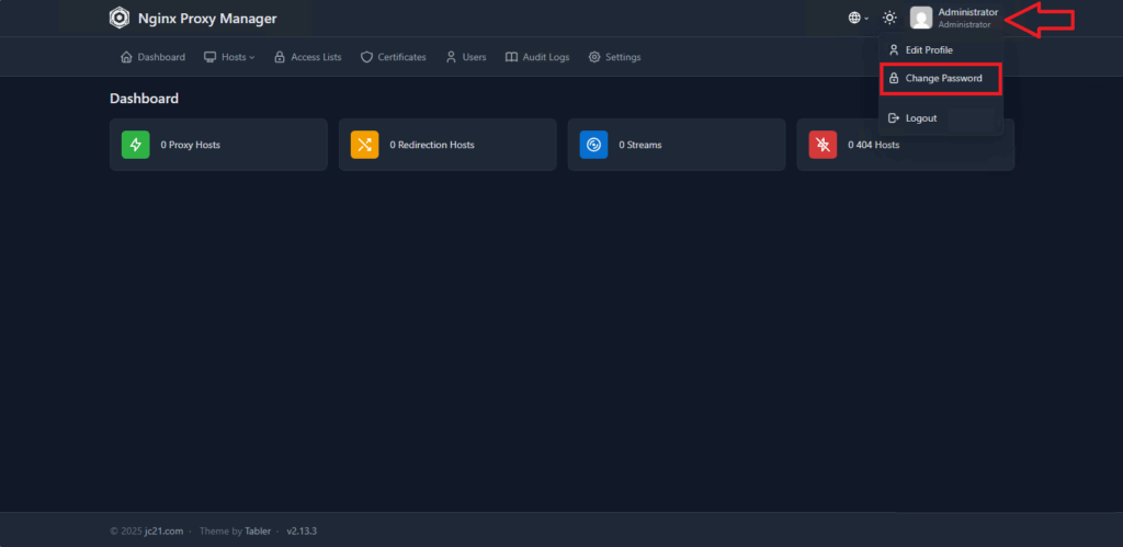 Cliccare sull’utente in alto a destra quindi selezionare Change Password