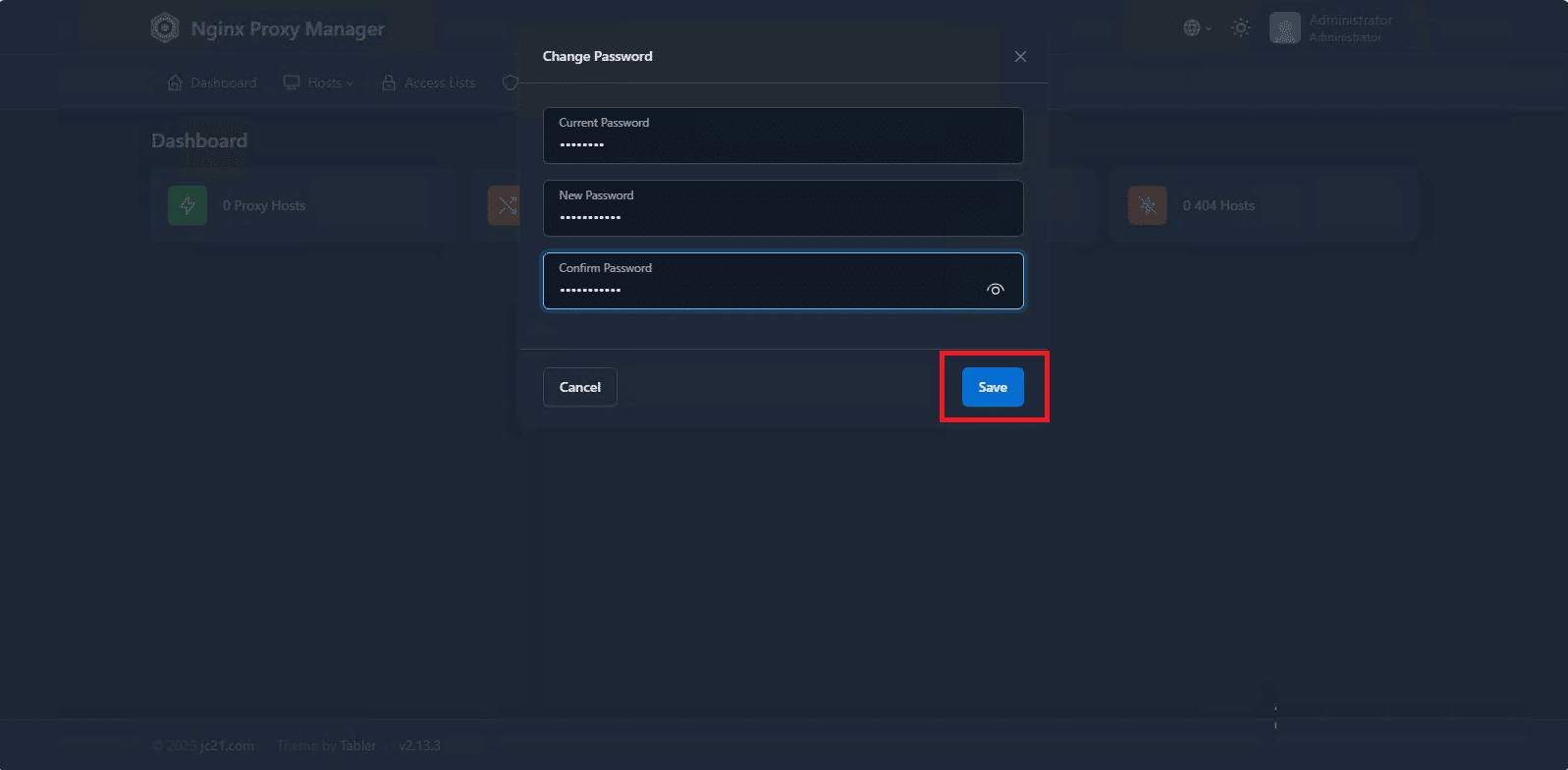 Inserire la vecchia password quindi due volte la nuova e cliccare su Save