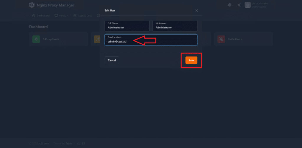 Modificare la mail quindi cliccare Save