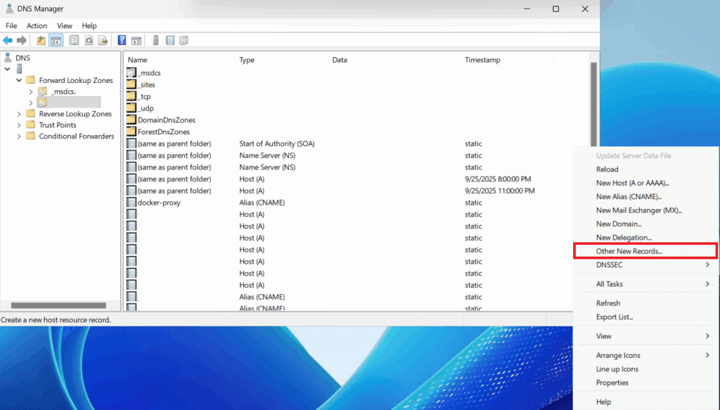 Facendo click destro in una zona senza record DNS (ad esempio a destra dell’ultima colonna) viene aperto un menù su cui è necessario selezionare Other New Records…: