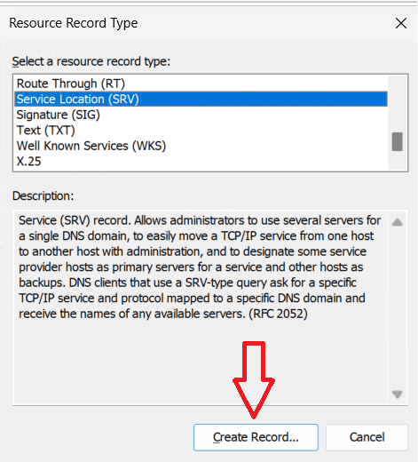 Selezionare Service Location (SRV) e cliccare su Create Record…: