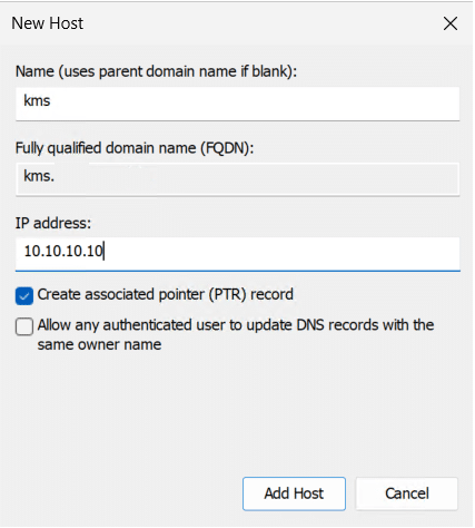 Fare attenzione a mantenere il punto alla fine di Host offering this service (ad esempio: kms.pizza.local.).