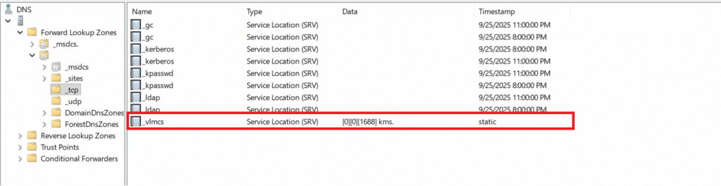 Per visualizzare i records SRV, navigare su _tcp all’interno della zona DNS: