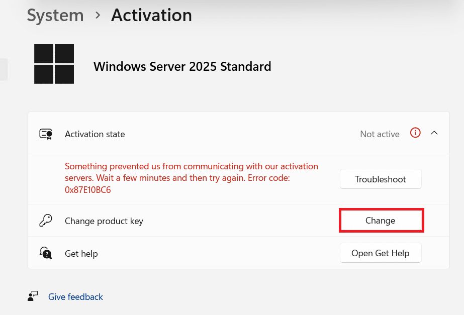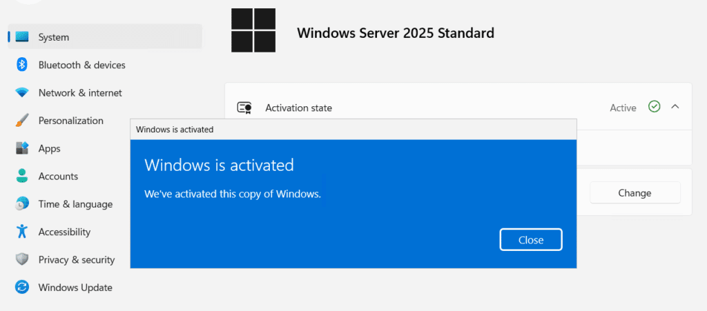 Su Windows Server 2025 (step analoghi sono possibili su tutte le versioni di Windows), navigare nelle Impostazioni su System, poi su About ed infine su Product key and activation.