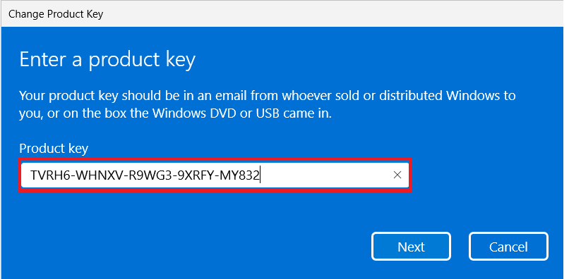Inserire la product key reperita sul sito Microsoft e cliccare su Next: