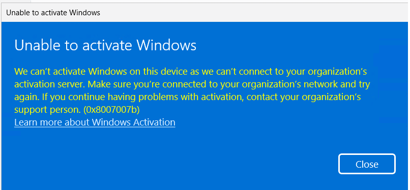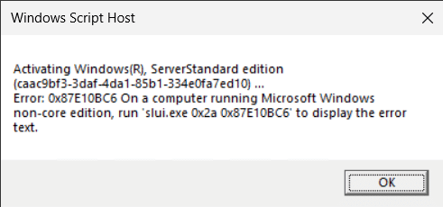 Se invece ci fossero problemi di comunicazione con il KMS, ad esempio perchè il server non appartiene al dominio in cui è stato creato il record SRV o per problemi di network, verrebbe mostrato il seguente errore: