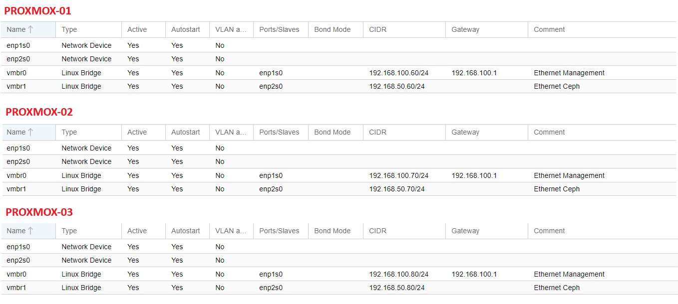 Nelle immagini di seguito viene riportata la configurazione delle schede di rete per i 3 host Proxmox, ovvero i 3 nodi del cluster.