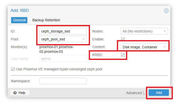Come da figura sovrastante inserire il nome ID ceph_storage_ssd e selezionare il Pool ceph_pool_ssd creato precedentemente.